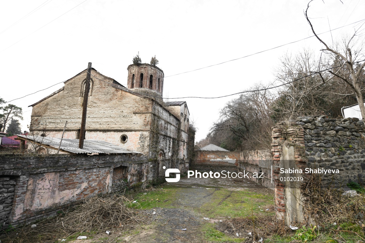 Zaqatala şəhərinin mərkəzində yerləşən bu məbəd 1830-ci ildə inşa edilib. Azərbaycan Respublikası Mədəniyyət Nazirliyinə görə kilsə əvvəllər IV–V əsrə aid Alban məbədi, indi isə XIX əsrə aid Rus kilsəsi kimi qeydiyyata alınıb. Yerli sakinlərin sözlərinə görə, bu məbəd öz ölçülərinə və memarlıq üslubuna görə həmin dövr olduğu məbədlərdən fərqlənir. Qırmızı kərpicdən inşa olunmuş məbədin geniş sütunlu və üç mərtəbəli zalı zəng qülləsi ilə tamamlanır. Məbədin inşasında şərq memarlığı elementlərindən geniş istifadə olunsa da, məbədin bayır divarlarındakı səkkizgüşəli xaçlar diqqəti daha çox cəlb edir. Sovet hakimiyyəti dövründə isə məbədin divarlarının boyandığı deyilir. Həmçinin sonradan bu məbəddə yanğın baş verdiyi də bildirilir. Hazırda bu məbəd baxımsız vəziyyətdədir.