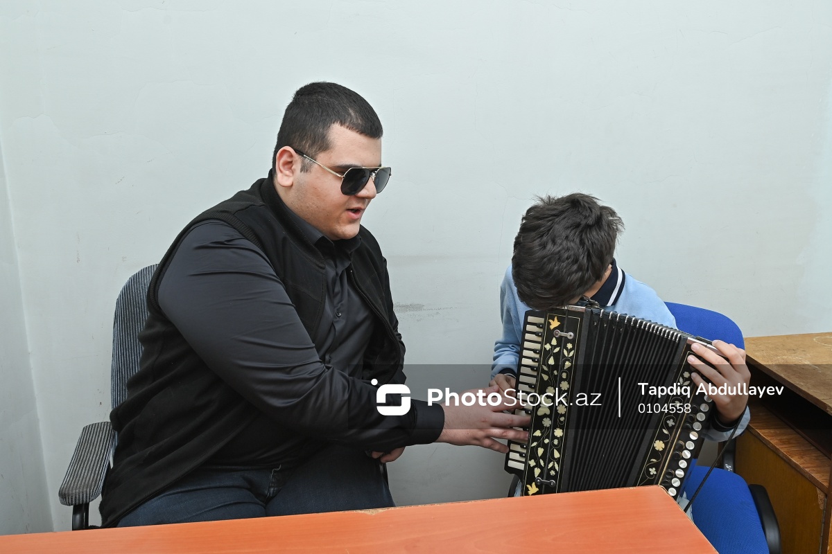 38 saylı gözdən əlil uşaqlar üçün 11 illik musiqi məktəbində qarmon musiqi alətinin ifası üzrə dərs keçən müəllim Məhəmməd Abışov (sol) və  3-cü sinif şagirdi Dəniz Qasımov (sağ).