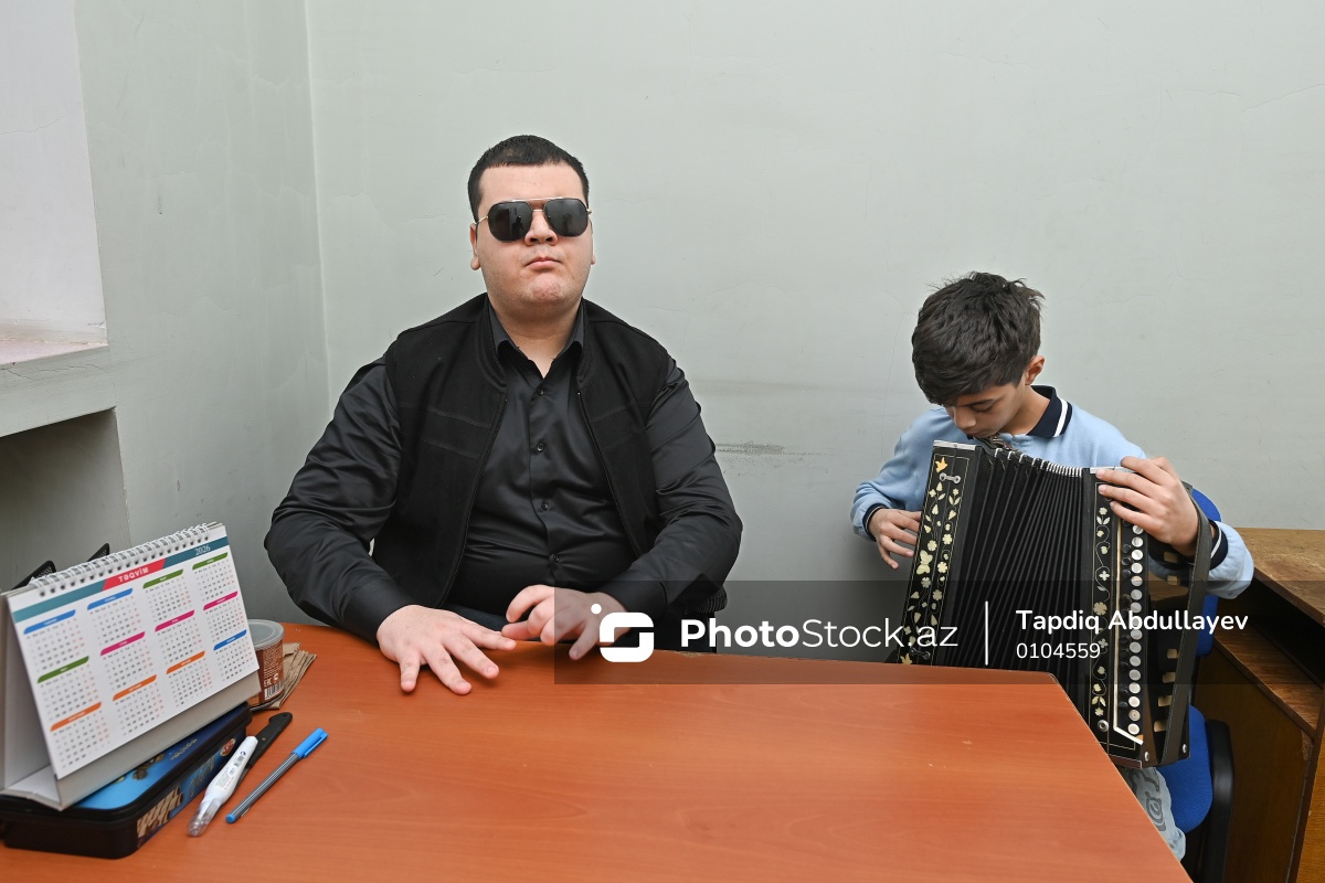 38 saylı gözdən əlil uşaqlar üçün 11 illik musiqi məktəbində qarmon musiqi alətinin ifası üzrə dərs keçən müəllim Məhəmməd Abışov (sol) və 3-cü sinif şagirdi Dəniz Qasımov (sağ).