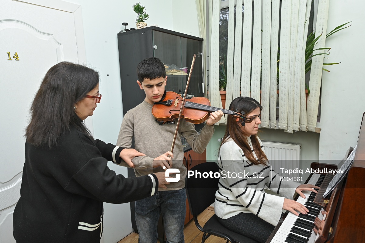 38 saylı gözdən əlil uşaqlar üçün 11 illik musiqi məktəbinin (soldan-sağa) müəllimi Təranə Hacıyeva, məktəbin şagirdi Həsən Nemətli, müşayiətçi müəllim Nigar Süleymanova.