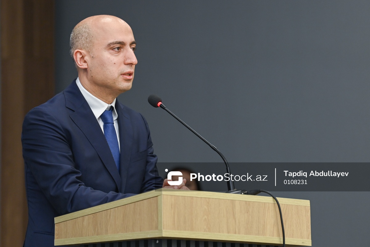 “Heydər Əliyev və suveren Azərbaycan” mövzusunda keçirilən konfransda iştirak edən Azərbaycan Respublikasının elm və təhsil naziri Emin Əmrullayev.
