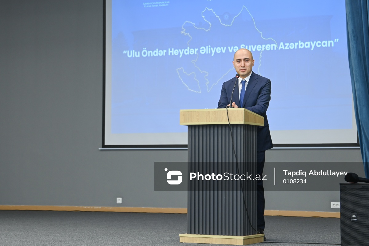 “Heydər Əliyev və suveren Azərbaycan” mövzusunda keçirilən konfransda iştirak edən Azərbaycan Respublikasının elm və təhsil naziri Emin Əmrullayev.