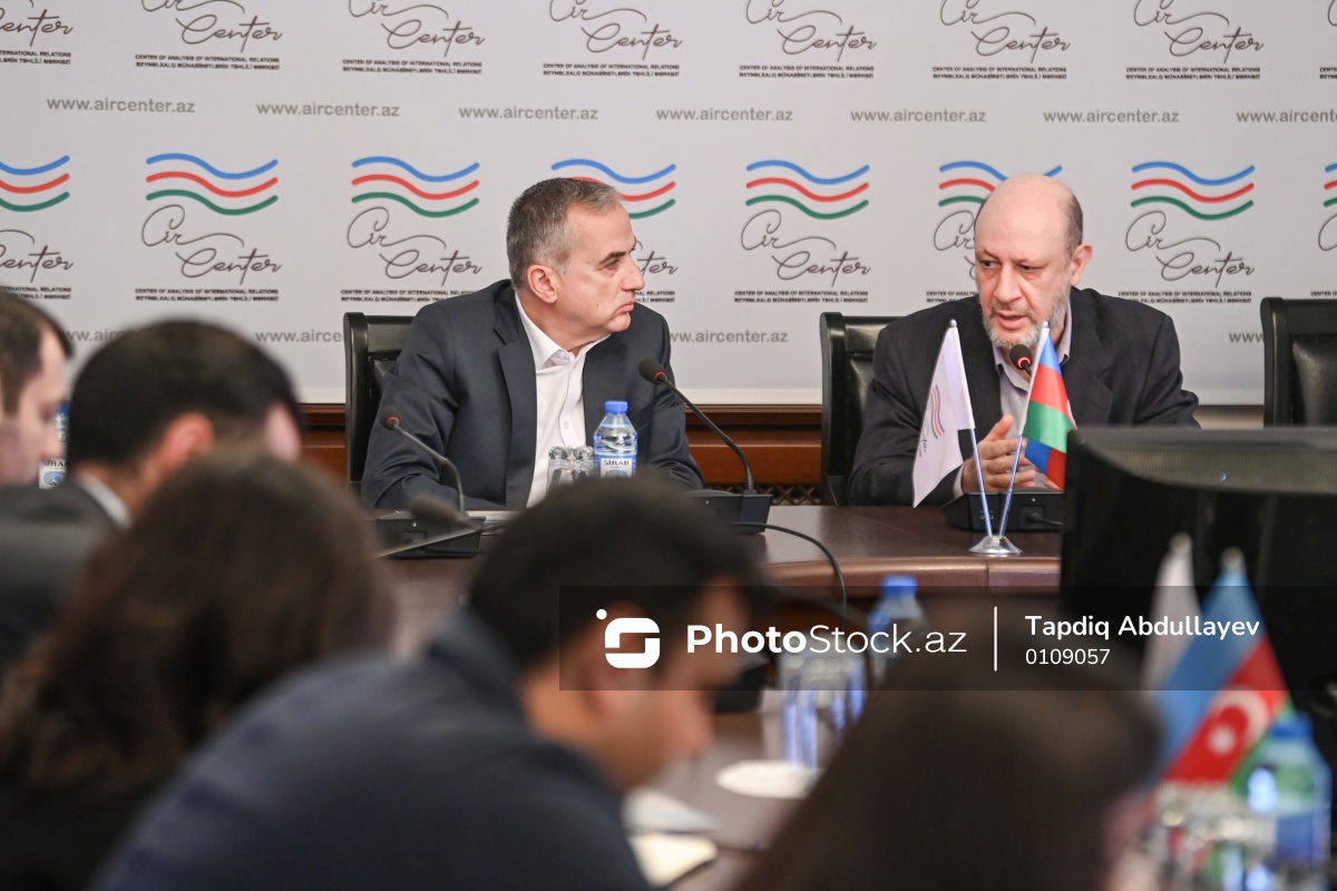 Beynəlxalq Münasibətlərin Təhlili Mərkəzinin (AIR Center) sədri Fərid Şəfiyev (sol), tanınmış videobloqer Albert İsakov (sağ).