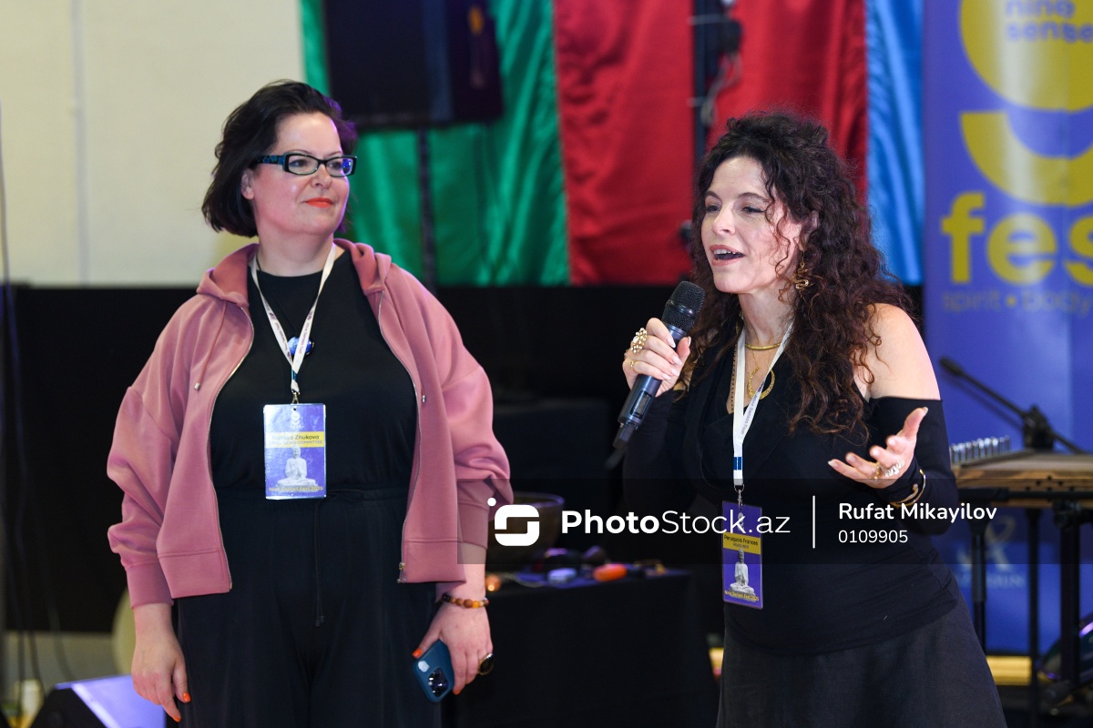 "Nine Senses Fest 2025"in açılış mərasimində iştirak edən incəsənət mərkəzinin direktoru Natalya Jukova (sol) və festivalın qonağı olan vokal yoqa ustadı Perukua (sağ).