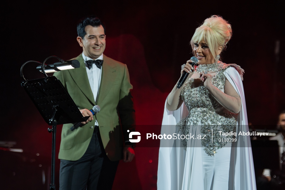 Mayın 5-də Heydər Əliyev Sarayında “Gəl qayıdaq o illərə" adlı solo konserti keçirilən Əməkdar artist Mətanət İsgəndərli (sağ) və konsertin aparıcısı Saleh Bağırov (sol).