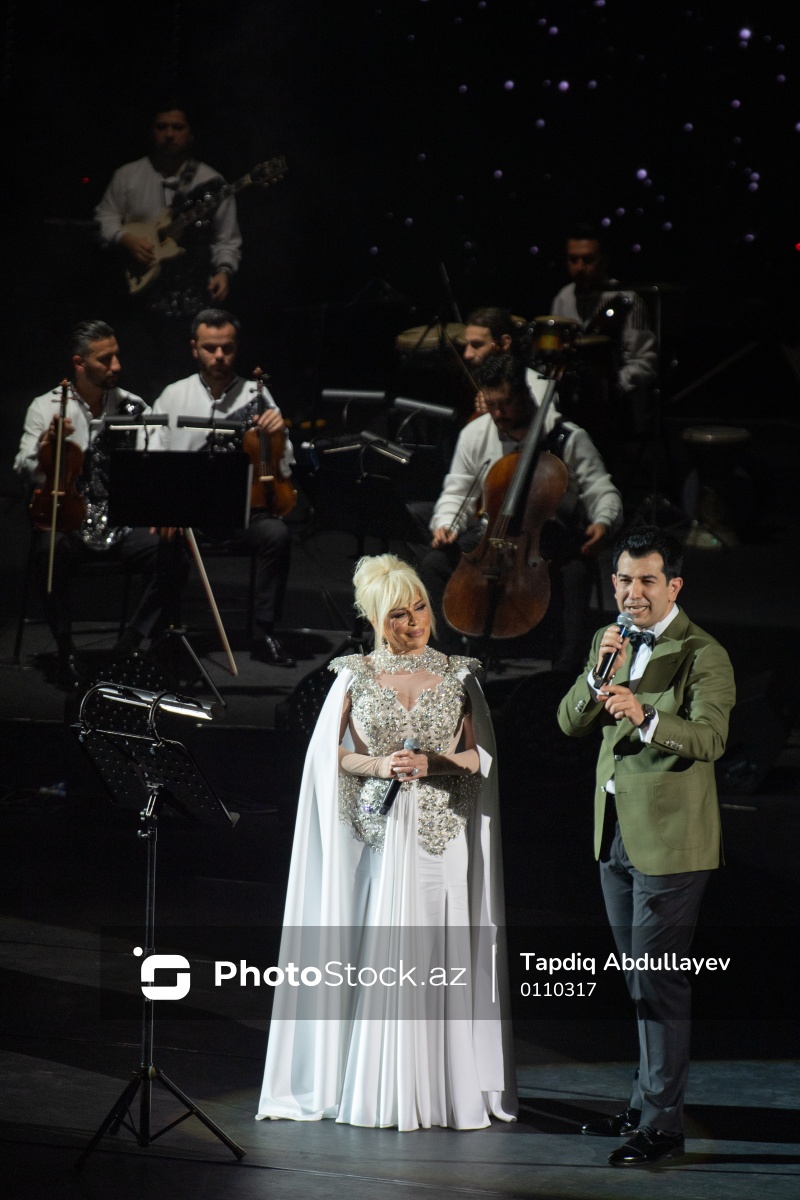 Mayın 5-də Heydər Əliyev Sarayında “Gəl qayıdaq o illərə" adlı solo konserti keçirilən Əməkdar artist Mətanət İsgəndərli (sol) və konsertin aparıcısı Saleh Bağırov (sağ).