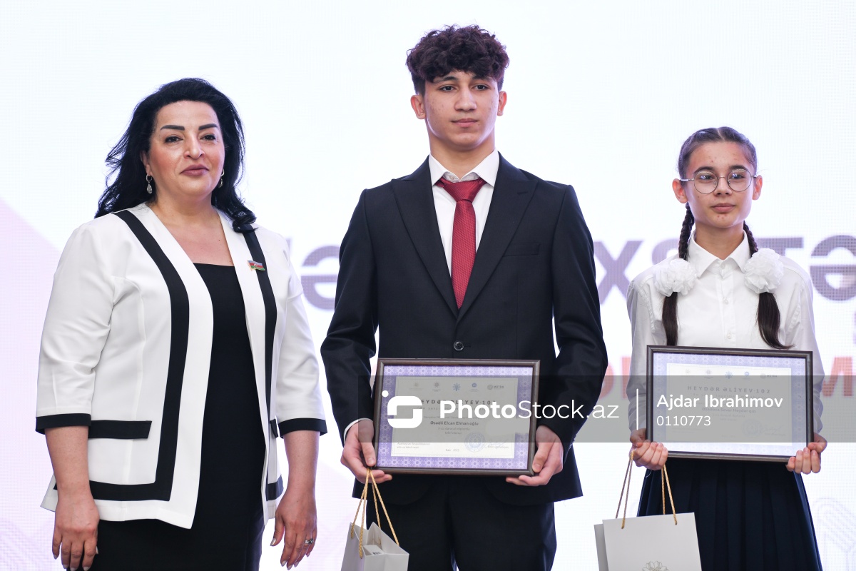 “Ən yaxşı təqdimat” müsabiqəsi qaliblərinin mükafatlandırılma mərasimində (soldan-sağa) qaliblərə diplomu təqdim edən Azərbaycan Respublikası Milli Məclisinin deputatı Fatma Yıldırım, 3-cü dərəcəli diplomla təltif olunan Bakı şəhəri 287 nömrəli "Zəkalar" liseyinin XI sinif şagirdi Elcan Əsədli, Naftalan şəhər Səməd Vurğun adına 2 nömrəli tam orta ümumtəhsil məktəbinin XI sinif şagirdi Sevər Əsədova.