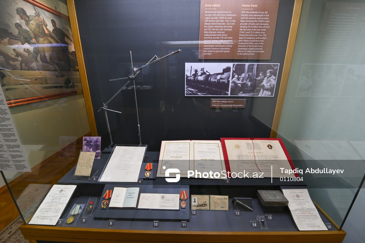 Milli Azərbaycan Tarixi Muzeyində müxtəlif tarixi eksponatlarla yanaşı, II Dünya müharibəsinə aid eksponatlar da nümayiş olunur. Azərbaycan xalqının faşizm üzərində qələbənin qazanılmasında rolunu əyani nümayiş etdirən bu eksponatlar arasında II Dünya müharibəsinə aid hərbi geyimlər, müxtəlif diplomlar, medallar və fotoşəkillər var. Muzeydə həmçinin Sovet İttifaqı Qəhrəmanı Həzi Aslanov və Azərbaycan-sovet sərkərdəsi, ilk azərbaycanlı kontr-admiral Cəlil Cavadovun hərbi geyimləri, təltifləri nümayiş olunur. Bununla yanaşı, burada II Dünya müharibəsi dövründə Azərbaycan hərbi hissələrinin cəbhəyə yollanmasına, 223-cü Azərbaycan atıcı diviziyasının hucumuna və azərbaycanlı döyüşçülərin Bradenburq qapısına bayraq sancmasına aid fotoşəkillər də görmək olar. Muzeydəki fotoşəkillərə diqqqətlə nəzər saldıqca II Dünya müharibəsi dövründə arxa cəbhədə Bakı neftinin müharibənin taleyi üçün önəmini daha yaxşı anlamaq olur.