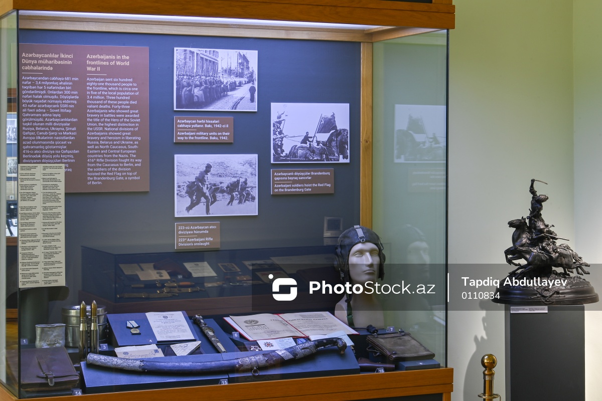 Milli Azərbaycan Tarixi Muzeyində müxtəlif tarixi eksponatlarla yanaşı, II Dünya müharibəsinə aid eksponatlar da nümayiş olunur. Azərbaycan xalqının faşizm üzərində qələbənin qazanılmasında rolunu əyani nümayiş etdirən bu eksponatlar arasında II Dünya müharibəsinə aid hərbi geyimlər, müxtəlif diplomlar, medallar və fotoşəkillər var. Muzeydə həmçinin Sovet İttifaqı Qəhrəmanı Həzi Aslanov və Azərbaycan-sovet sərkərdəsi, ilk azərbaycanlı kontr-admiral Cəlil Cavadovun hərbi geyimləri, təltifləri nümayiş olunur. Bununla yanaşı, burada II Dünya müharibəsi dövründə Azərbaycan hərbi hissələrinin cəbhəyə yollanmasına, 223-cü Azərbaycan atıcı diviziyasının hucumuna və azərbaycanlı döyüşçülərin Bradenburq qapısına bayraq sancmasına aid fotoşəkillər də görmək olar. Muzeydəki fotoşəkillərə diqqqətlə nəzər saldıqca II Dünya müharibəsi dövründə arxa cəbhədə Bakı neftinin müharibənin taleyi üçün önəmini daha yaxşı anlamaq olur.