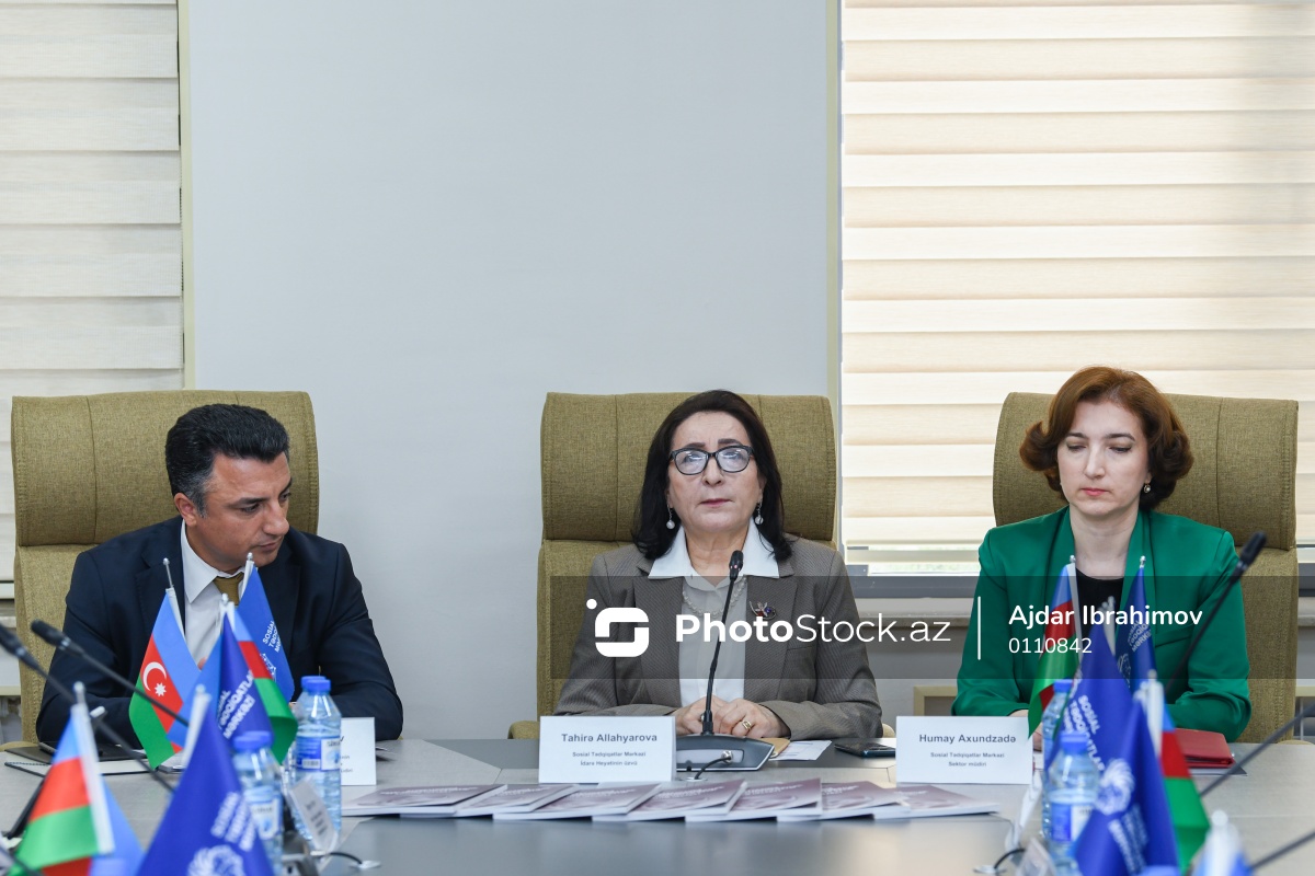 “Nəsillərarası həmrəylik ailə münasibətləri və dayanıqlı inkişaf kontekstində” mövzusunda dəyirmi masada iştirak edən (soldan-sağa) Milli Məclisin Sosial Qanunvericilik şöbəsinin Humanitar məsələlər üzrə qanunvericilik sektorunun müdiri Şahin Quliyev, Sosial Tədqiqatlar Mərkəzinin İdarə Heyətinin üzvü Tahirə Allahyarova, Sosial Tədqiqatlar Mərkəzinin Sektor müdiri Humay Axundzadə.