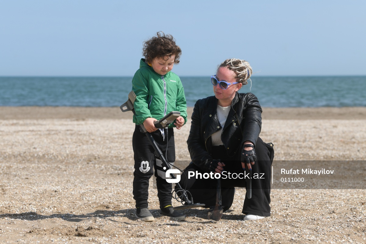 Metal detektoru ilə Xəzər sahilində dəyərli əşyalar axtaran Svetlana Kazımova
