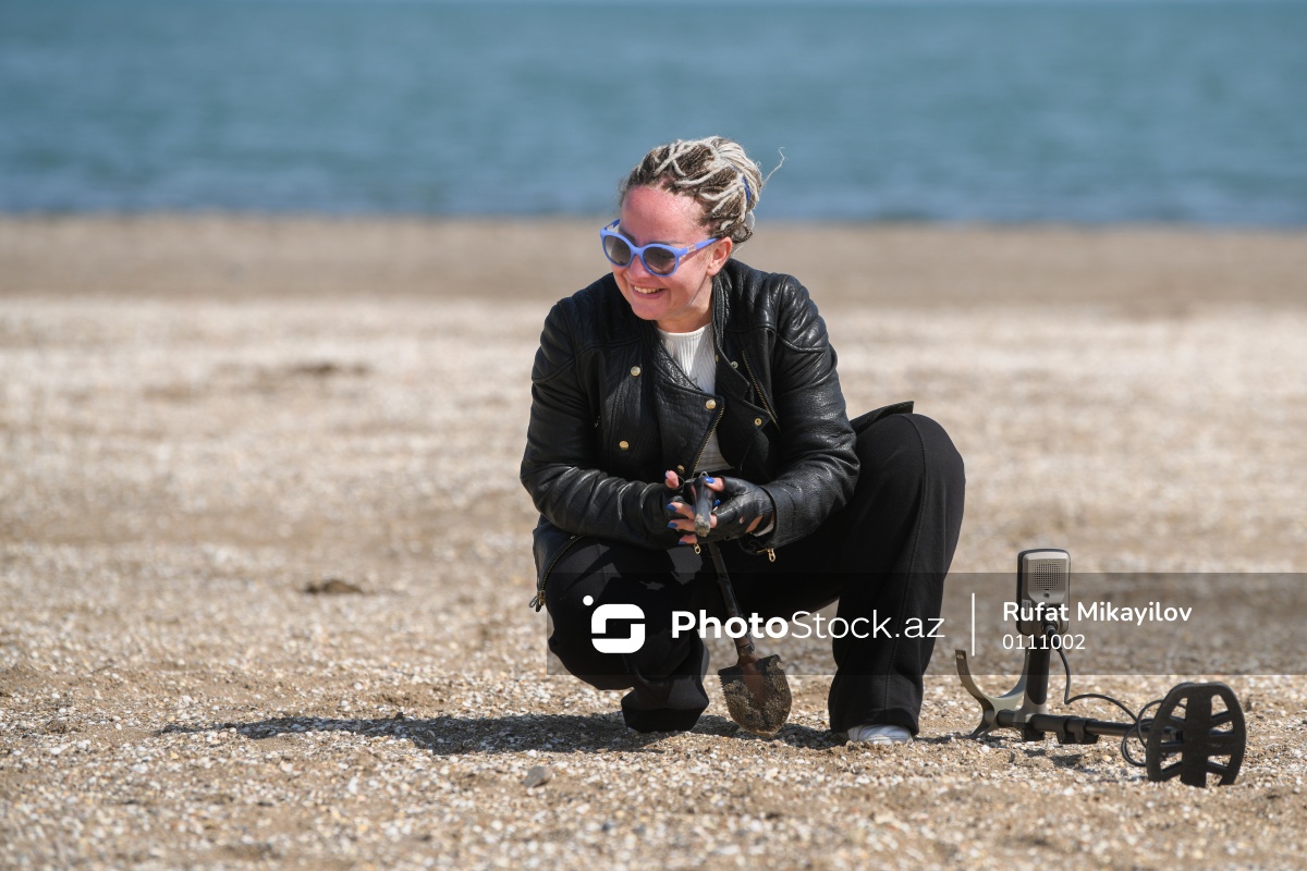 Metal detektoru ilə Xəzər sahilində dəyərli əşyalar axtaran Svetlana Kazımova