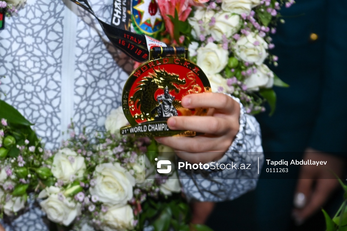 İtaliyanın Peruca şəhərində keçirilən dünya çempionatında yüksək nəticələr əldə edən kunq-fu üzrə Azərbaycan millisinin üzvləri Vətənə qayıdıblar. Onları Heydər Əliyev Beynəlxalq Aeroportunda media mənsubları, azarkeşlər və idmançıların yaxınları qarşılayıblar. "Light sanda" növü üzrə mübarizə aparan idmançılarımız yarışı 5-i qızıl, 2-si gümüş olmaqla, ümumilikdə 7 medalla başa vurublar. Qızların yarışında Heydər Əliyev Fondunun vitse-prezidenti Leyla Əliyevanın qızı, Prezident İlham Əliyevin nəvəsi Əminə Əliyeva (11 yaş, 38 kiloqram) dünya çempionu olub. Oğlanlar arasında isə Rəsul Əsgərov (11-12 yaş, 36 kiloqram), Hüseyn Əliyev (13-15 yaş, 48 kiloqram), Toğrul Mikayılov (böyüklər, 65 kiloqram), Eller Orucov (böyüklər, 75 kiloqram) qızıl, Əli Baxışov (11-12 yaş, 33 kiloqram) və Əkbər Əhmədzadə (13-15 yaş, 70 kiloqram) gümüş mükafata yiyələniblər.