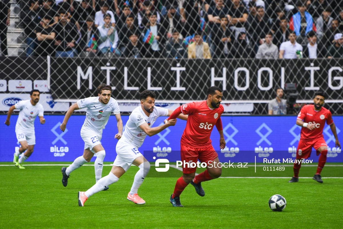 21.05.2025 Milli Gimnastika Arenası, Minifutbol üzrə Dünya Çempionatının Azərbaycan – Bəhreyn oyunununda (soldan-sağa) Azərbaycan Minifutbol millisinin oyunçuları Ravan Karimov, Mirmehdi Rzayev, Bəhreyn Minifutbol millisinin oyunçusu Ammar Ali mübarizəsi.