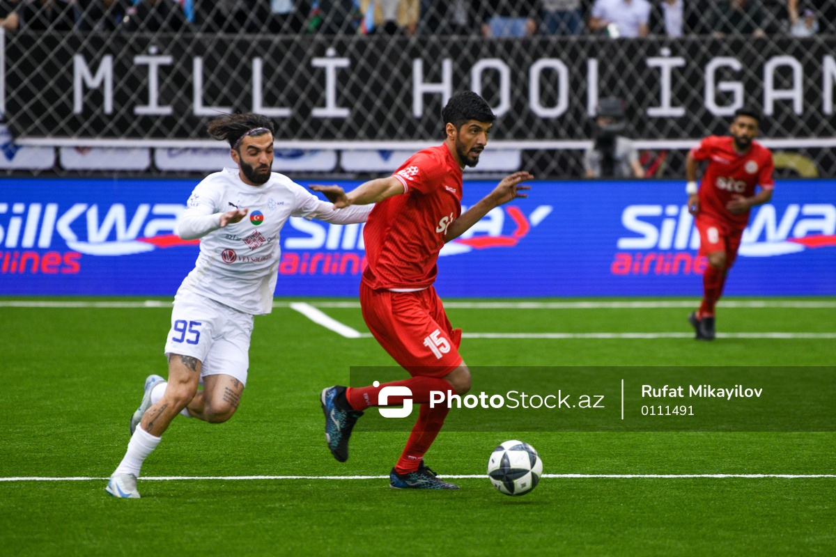 21.05.2025 Milli Gimnastika Arenası, Minifutbol üzrə Dünya Çempionatının Azərbaycan – Bəhreyn oyunununda Azərbaycan Minifutbol millisinin oyunçusu Eshgin Taghiyev (sol), Bəhreyn Minifutbol millisinin oyunçusu Jassam Anan (sağ) mübarizəsi.