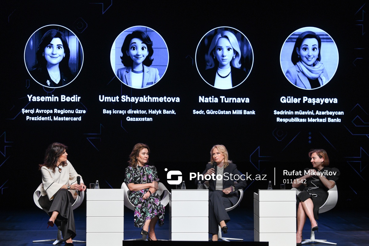 Bakıda keçirilən “SHE Congress 2025” tədbirində iştirak edən (soldan-sağa) "MasterCard" şirkətinin Şərqi Avropa Regionu üzrə prezidenti Yasemin Bedir, Qazaxıstanın “Halyk Bank”ının baş icraçı direktoru Umut Şayaxmetova, Gürcüstan Milli Bankının sədri Natia Turnava, Azərbaycan Respublikası Mərkəzi Banknın sədr müavini Gülər Paşayeva.