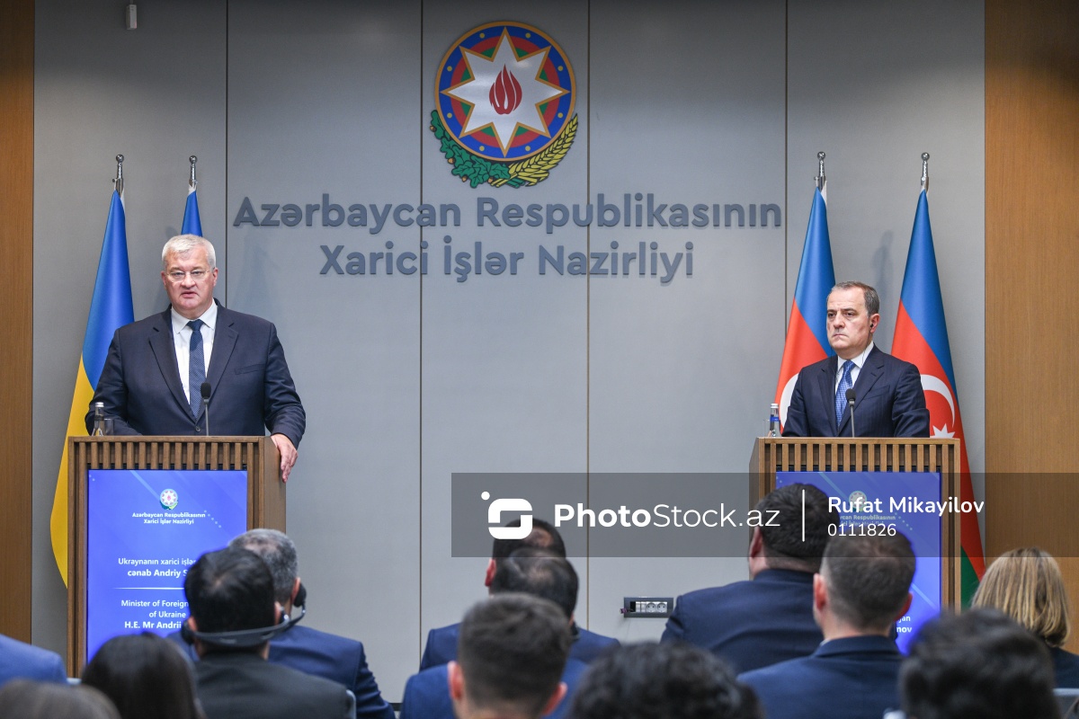 Azərbaycan Respublikasının xarici işlər naziri Ceyhun Bayramov (sağ) və Ukraynanın xarici işlər naziri Andrey Sibiqa (sol).