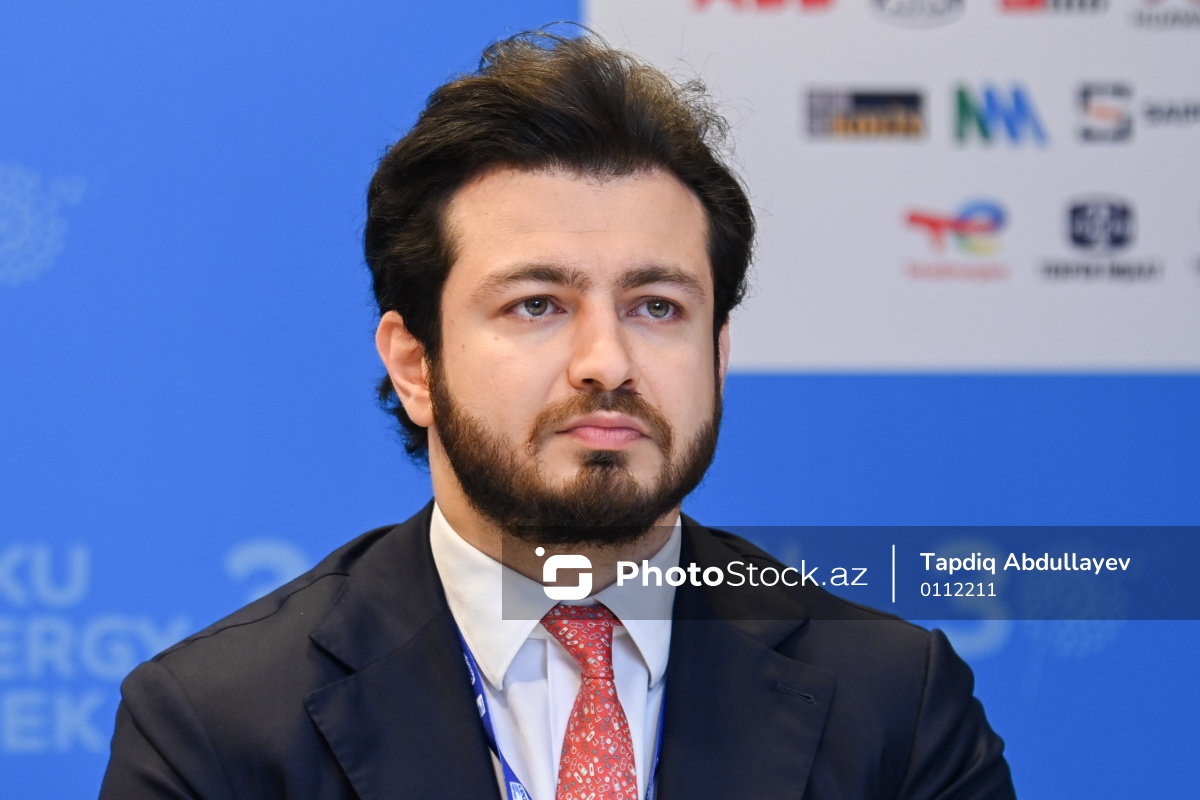 Bakı Enerji Həftəsinə həsr olunmuş mətbuat konfransında iştirak edən Azərbaycan Dövlət Neft Şirkətinin (SOCAR) mətbuat katibi Orxan Hüseynov.