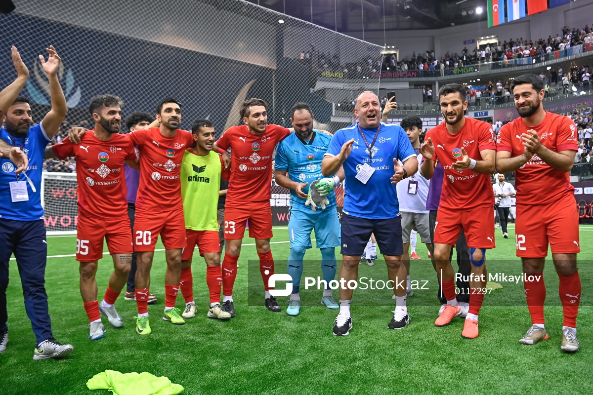 29.05.2025 Milli Gimnastika Arenası, Minifutbol üzrə Dünya Çempionatının Azərbaycan – İngiltərə oyunununda qələbə sevincini yaşayan (soldan-sağa) məşqçi Sərxan Məstiyev, Azərbaycan Minifutbol millisinin oyunçuları Eshgin Taghiyev, Mahammad Khalilov, Mirkamal Alıyev, Ravan Karimov, Vali Gafarov, məşqçi Ramin Həsənzadə, Azərbaycan Minifutbol millisinin oyunçuları Vusal İsayev, Kamran Abdullazade.