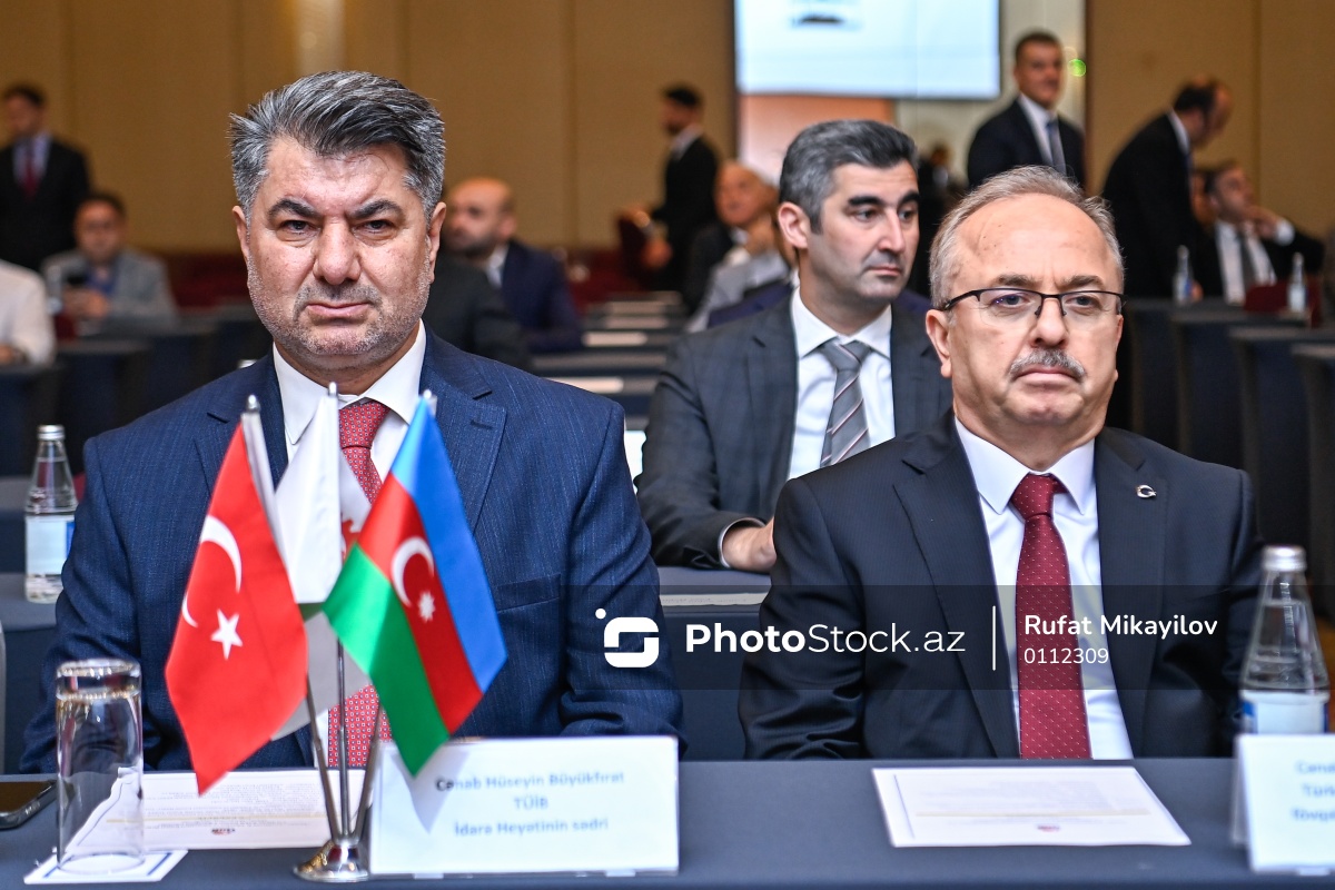 TÜİB-in VI Dönəm Seçkili Ümumi Yığıncağında iştirak edən TÜİB-in İdarə Heyətinin sədri Hüseyin Büyükfırat (sol), Türkiyə Respublikasının Azərbaycandakı fövqəladə və səlahiyyətli səfiri Birol Akgün (sağ).