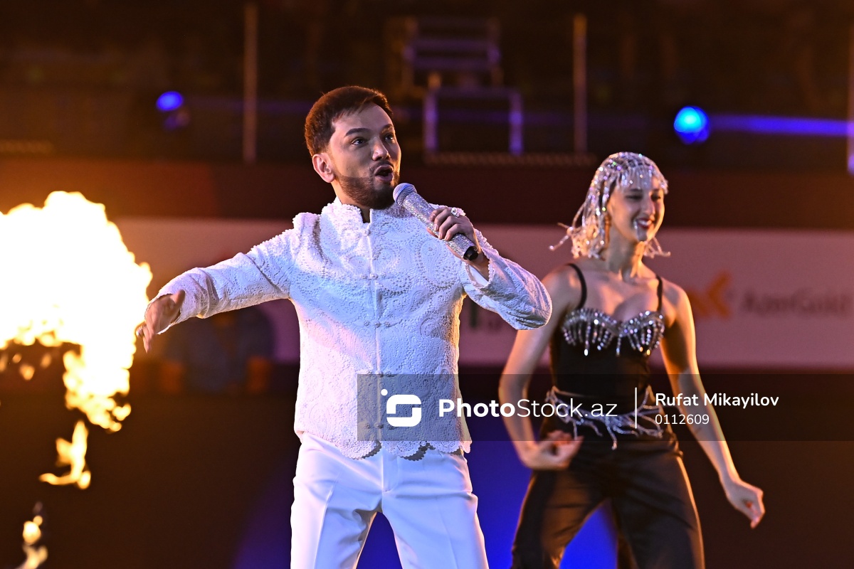 Bakıda keçirilən minifutbol üzrə dünya çempionatının bağlanış mərasimində çıxış edən Xalq artisti Faiq Ağayev.