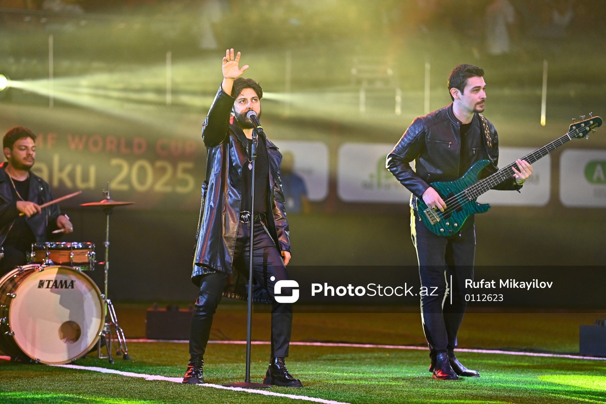 Bakıda keçirilən minifutbol üzrə dünya çempionatının bağlanış mərasimində çıxış edən müğənni Mərdan Kazımov.