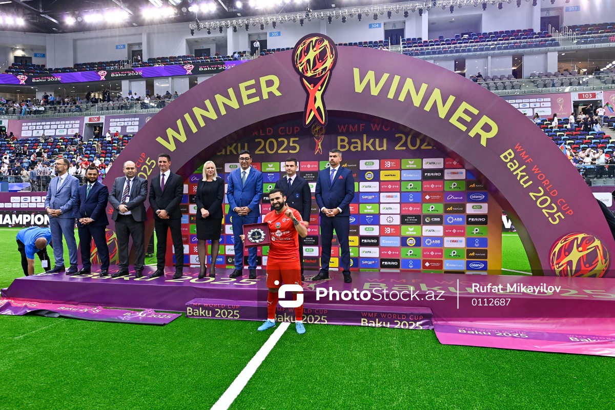 Bakıda təşkil olunan minifutbol üzrə dünya çempionatının mükafatlandırma mərasimi keçirilib. Milli Gimnastika Arenasında baş tutan tədbirdə Dünya Minifutbol Federasiyasının prezidenti Filip Juda, vitse-prezidenti Peter Kralik, gənclər və idman naziri Fərid Qayıbov və digər rəsmi şəxslər iştirak ediblər. Açılışda ön sözlə çıxış edən Fərid Qayıbov mundialın ölkəmizdə yüksək səviyyədə təşkil olunmasından danışıb və qələbə münasibəti ilə Azərbaycan xalqını təbrik edib. Daha sonra mundialın qalibi olan Azərbaycan yığması qızıl medal və kubokla təltif edilib. İkinci yerin sahibi olan Macarıstan futbolçuları gümüş, üçüncü olan Serbiya komandası isə bürünc medallarla mükafatlandırılıb.