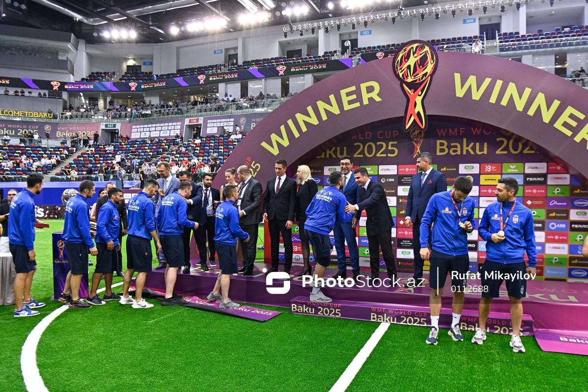 Bakıda təşkil olunan minifutbol üzrə dünya çempionatının mükafatlandırma mərasimi keçirilib. Milli Gimnastika Arenasında baş tutan tədbirdə Dünya Minifutbol Federasiyasının prezidenti Filip Juda, vitse-prezidenti Peter Kralik, gənclər və idman naziri Fərid Qayıbov və digər rəsmi şəxslər iştirak ediblər. Açılışda ön sözlə çıxış edən Fərid Qayıbov mundialın ölkəmizdə yüksək səviyyədə təşkil olunmasından danışıb və qələbə münasibəti ilə Azərbaycan xalqını təbrik edib. Daha sonra mundialın qalibi olan Azərbaycan yığması qızıl medal və kubokla təltif edilib. İkinci yerin sahibi olan Macarıstan futbolçuları gümüş, üçüncü olan Serbiya komandası isə bürünc medallarla mükafatlandırılıb.