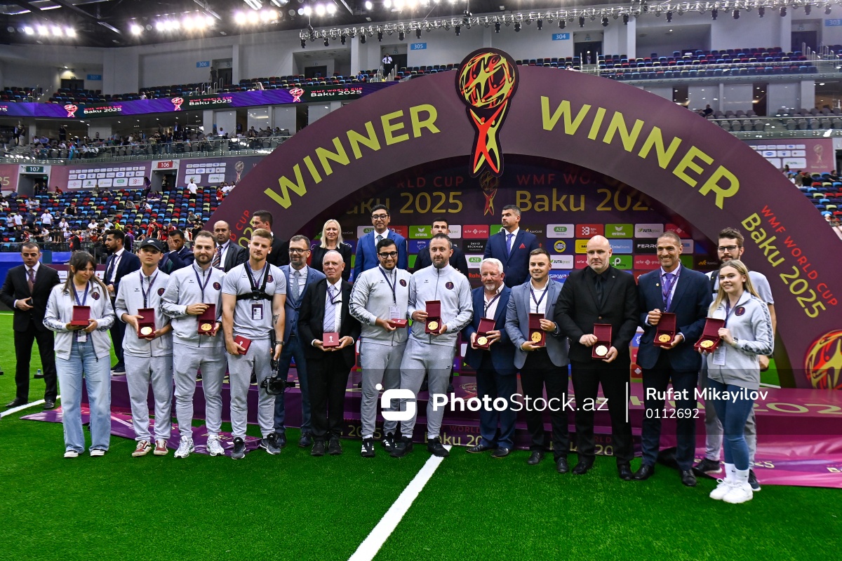 Bakıda təşkil olunan minifutbol üzrə dünya çempionatının mükafatlandırma mərasimi keçirilib. Milli Gimnastika Arenasında baş tutan tədbirdə Dünya Minifutbol Federasiyasının prezidenti Filip Juda, vitse-prezidenti Peter Kralik, gənclər və idman naziri Fərid Qayıbov və digər rəsmi şəxslər iştirak ediblər. Açılışda ön sözlə çıxış edən Fərid Qayıbov mundialın ölkəmizdə yüksək səviyyədə təşkil olunmasından danışıb və qələbə münasibəti ilə Azərbaycan xalqını təbrik edib. Daha sonra mundialın qalibi olan Azərbaycan yığması qızıl medal və kubokla təltif edilib. İkinci yerin sahibi olan Macarıstan futbolçuları gümüş, üçüncü olan Serbiya komandası isə bürünc medallarla mükafatlandırılıb.
