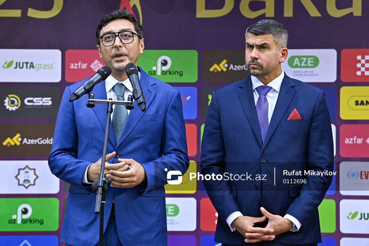 Azərbaycan Respublikasının gənclər və idman naziri Fərid Qayıbov (sol), Dünya Minifutbol Federasiyasının (WMF) prezidenti Filip Juda (sağ).