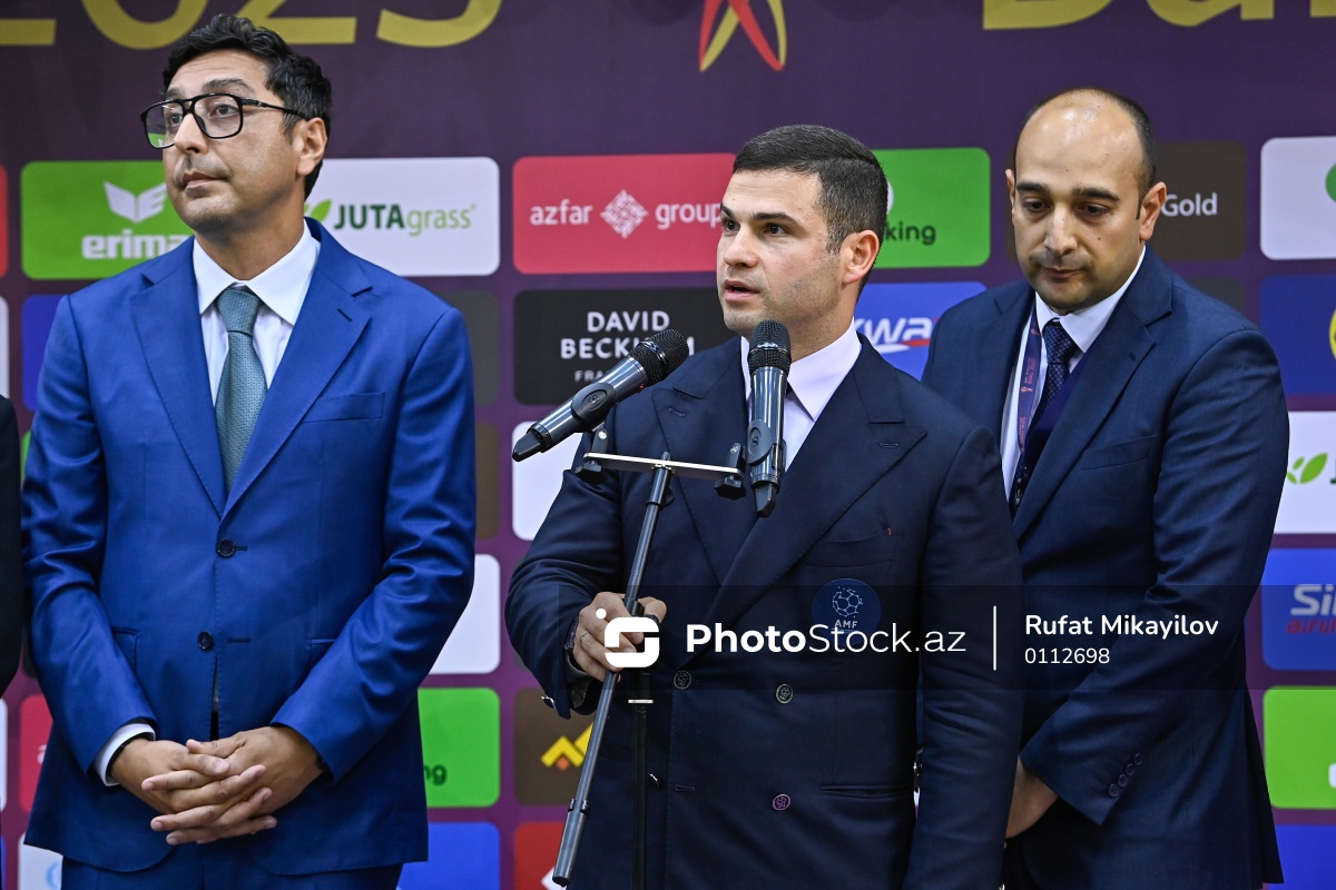 Bakıda təşkil olunan minifutbol üzrə dünya çempionatının mükafatlandırma mərasimində çıxış edən Azərbaycan Minifutbol Federasiyasının prezidenti Orxan Məmmədov.