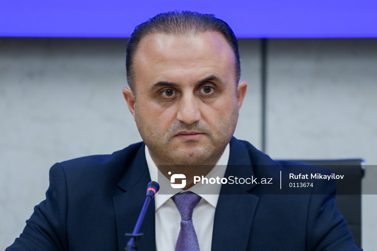 6-cı "Yerli şirkətlərin tanıtım sərgisi"nə həsr olunmuş mətbuat konfransında iştirak edən İqtisadiyyat Nazirliyi yanında Kiçik və Orta Biznesin İnkişafı Agentliyinin (KOBİA) İdarə Heyətinin sədrinin I müavini Samir Hümbətov.