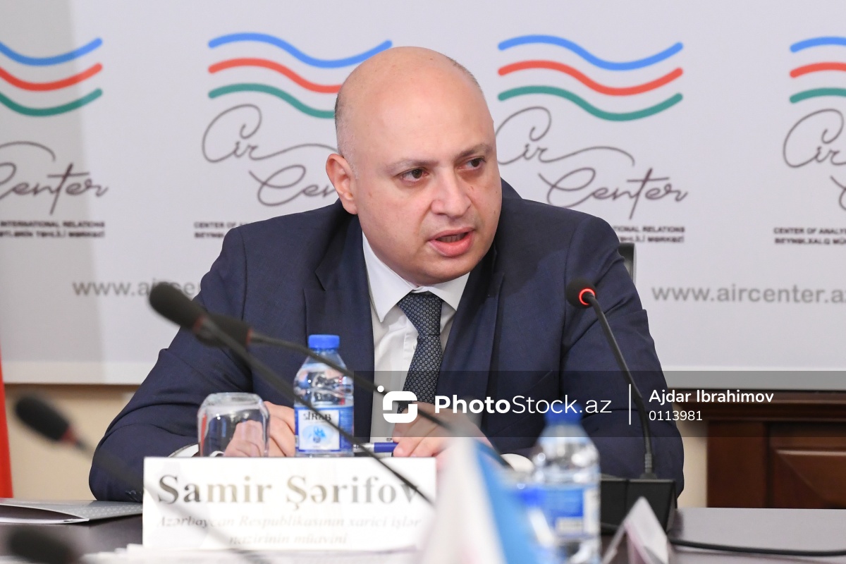“Azərbaycan Respublikası ilə Türkmənistan Respublikası arasında çoxşaxəli əməkdaşlıq: nailiyyətlər və perspektivlər” mövzusunda tədbirdə iştirak edən Azərbaycanın xarici işlər nazirinin müavini Samir Şərifov.