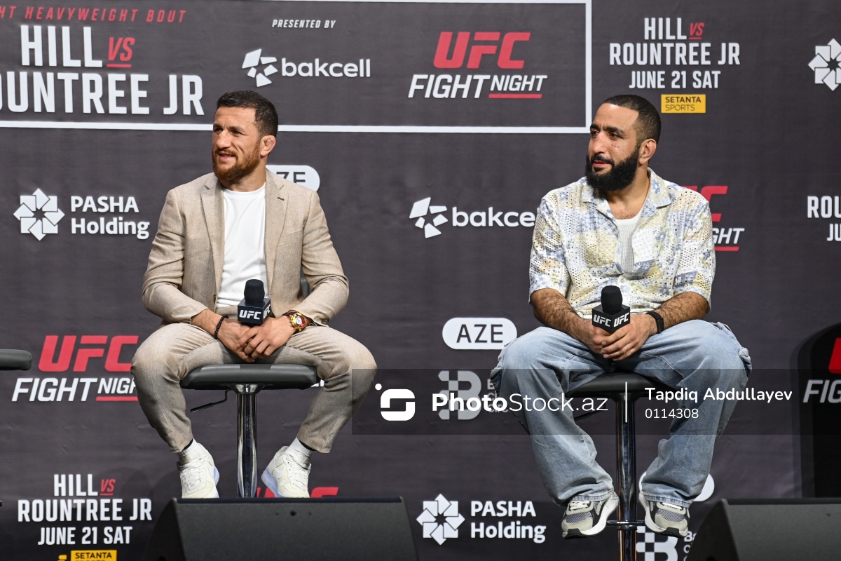 Bakıda keçiriləcək Mütləq Döyüş Çempionatı (UFC) turnirinin ulduz qonağı, superyüngül çəki dərəcəsində UFC çempionu, gürcü döyüşçü Merab Dvalişvili (sol), Bakıda keçiriləcək Mütləq Döyüş Çempionatı (UFC) turnirinin ulduz qonağı, keçmiş yarımorta çəki üzrə çempion, amerikalı döyüşçü Belal Məhəmməd (sağ)..