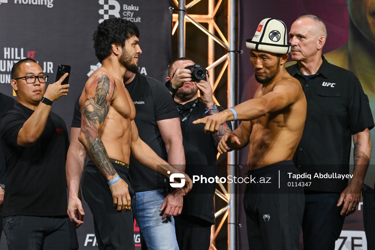 Mütləq Döyüş Çempionatının (UFC) Bakıda keçiriləcək turnirində iştirak edəcək UFC döyüşçüləri Tofiq Musayev (sol), Mıktıbek Orolbai (sağ) üz-üzə gəliblər.