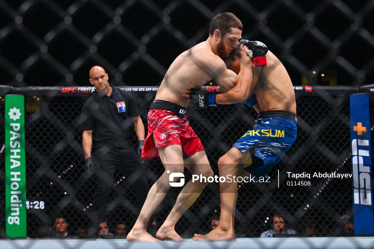 Bakıda ilk dəfə keçirilən “UFC Fight Night”da iştirak edən rusiyalı UFC döyüşçüsü Taqir Ulanbekov (sol), qazaxıstanlı UFC döyüşçüsü Maksum Azat sağ).
