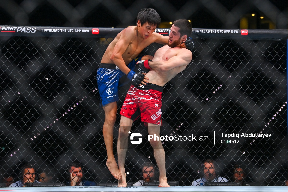 Bakıda ilk dəfə keçirilən “UFC Fight Night”da iştirak edən qazaxıstanlı UFC döyüşçüsü Maksum Azat (sol), rusiyalı UFC döyüşçüsü Taqir Ulanbekov (sağ).