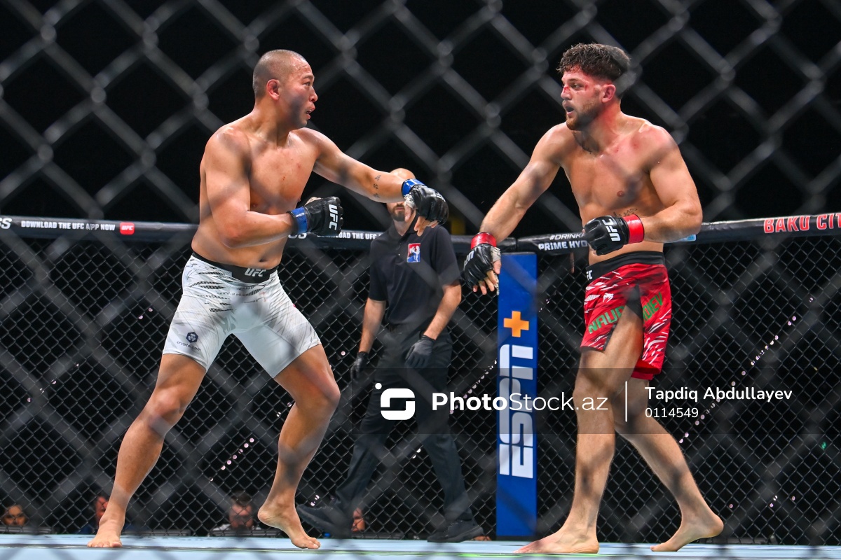 Bakıda ilk dəfə keçirilən “UFC Fight Night”da iştirak edən cənubi koreyalı UFC döyüşçüsü Pak Çun Yon (sol), mərakeşli UFC döyüşçüsü İsmail Naurdiyev (sağ).