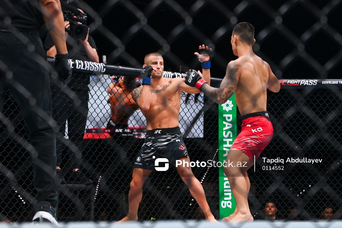 Bakıda ilk dəfə keçirilən “UFC Fight Night”da iştirak edən uelsli UFC döyüşçüsü Oban Elliott (sol), cənubi koreyalı UFC döyüşçüsü Sok Hyön Ko (sağ).