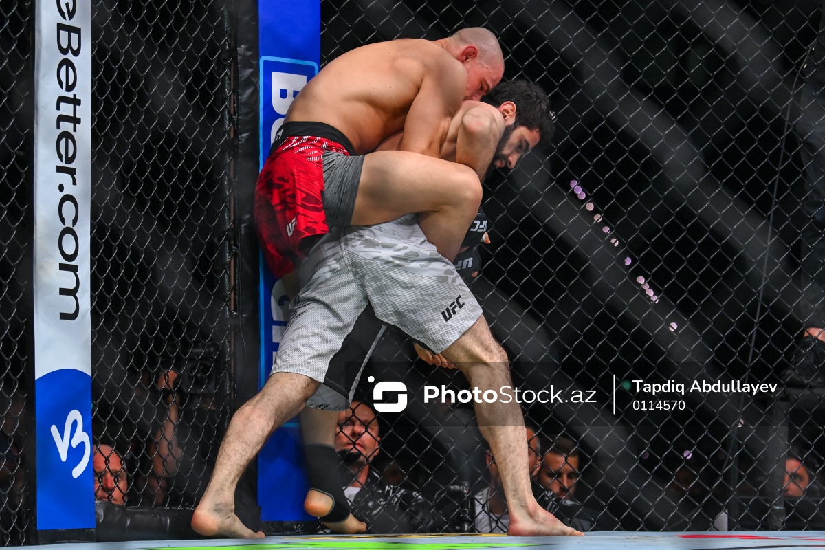 Bakıda ilk dəfə keçirilən “UFC Fight Night”da iştirak edən avstriyalı UFC döyüşçüsü Boqdan Qrad (sol), tacikistanlı UFC döyüşçüsü Məhəmməd Naimov (sağ).