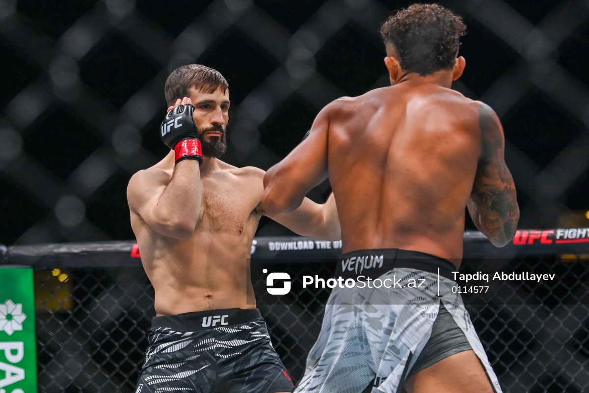 Bakıda ilk dəfə keçirilən “UFC Fight Night”da iştirak edən azərbaycanlı UFC döyüşçüsü Nazim Sadıxov (sol), braziliyalı UFC döyüşçüsü Nikolas Motta (sağ).