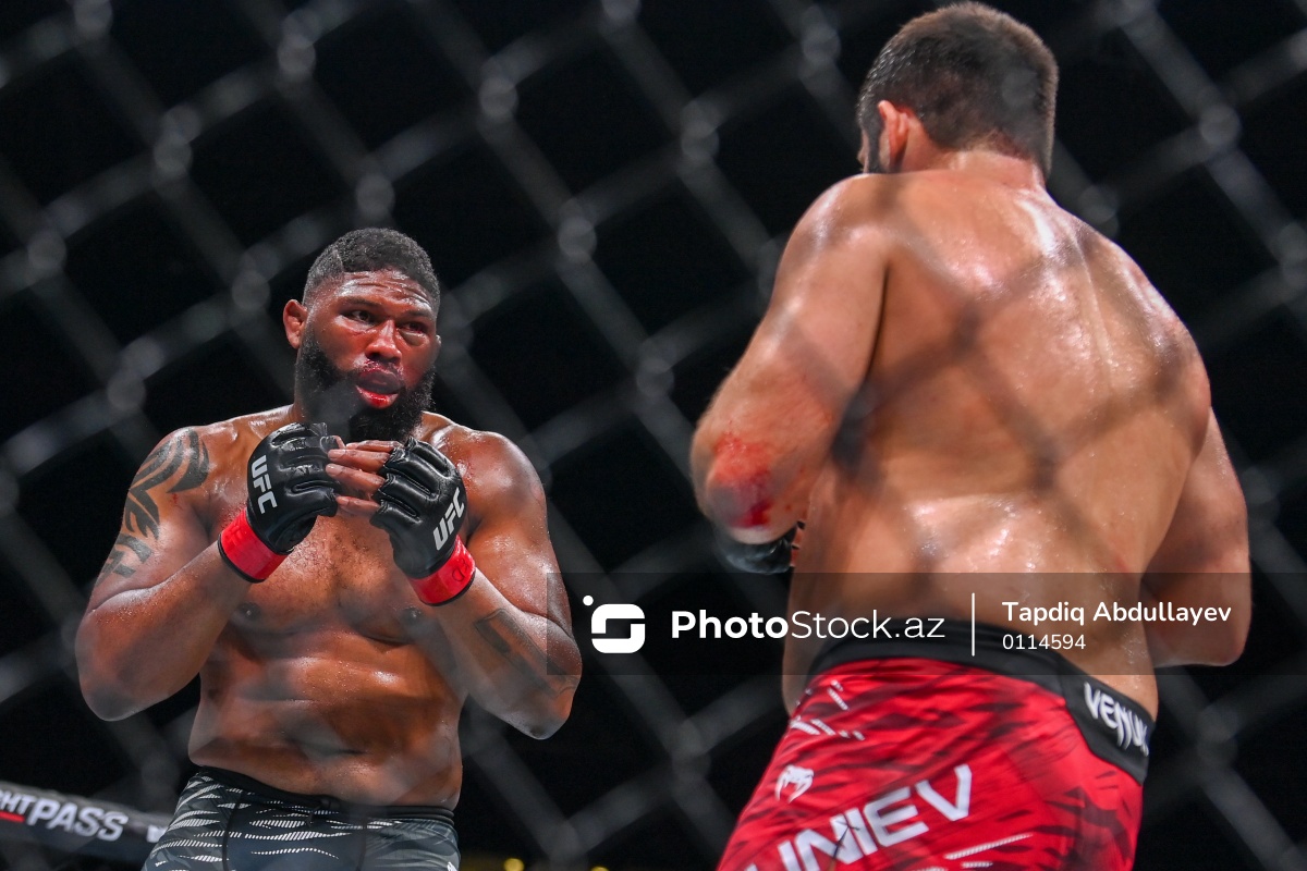 Bakıda ilk dəfə keçirilən “UFC Fight Night”da iştirak edən amerikalı UFC döyüşçüsü Körtis Bleyds (sol), rusiyalı UFC döyüşçüsü Rizvan Kuniyev (sağ).
