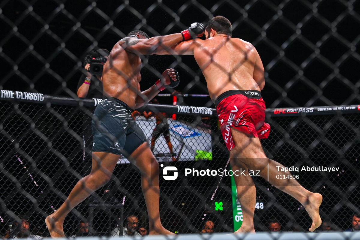Bakıda ilk dəfə keçirilən “UFC Fight Night”da iştirak edən amerikalı UFC döyüşçüsü Körtis Bleyds (sol), rusiyalı UFC döyüşçüsü Rizvan Kuniyev (sağ).