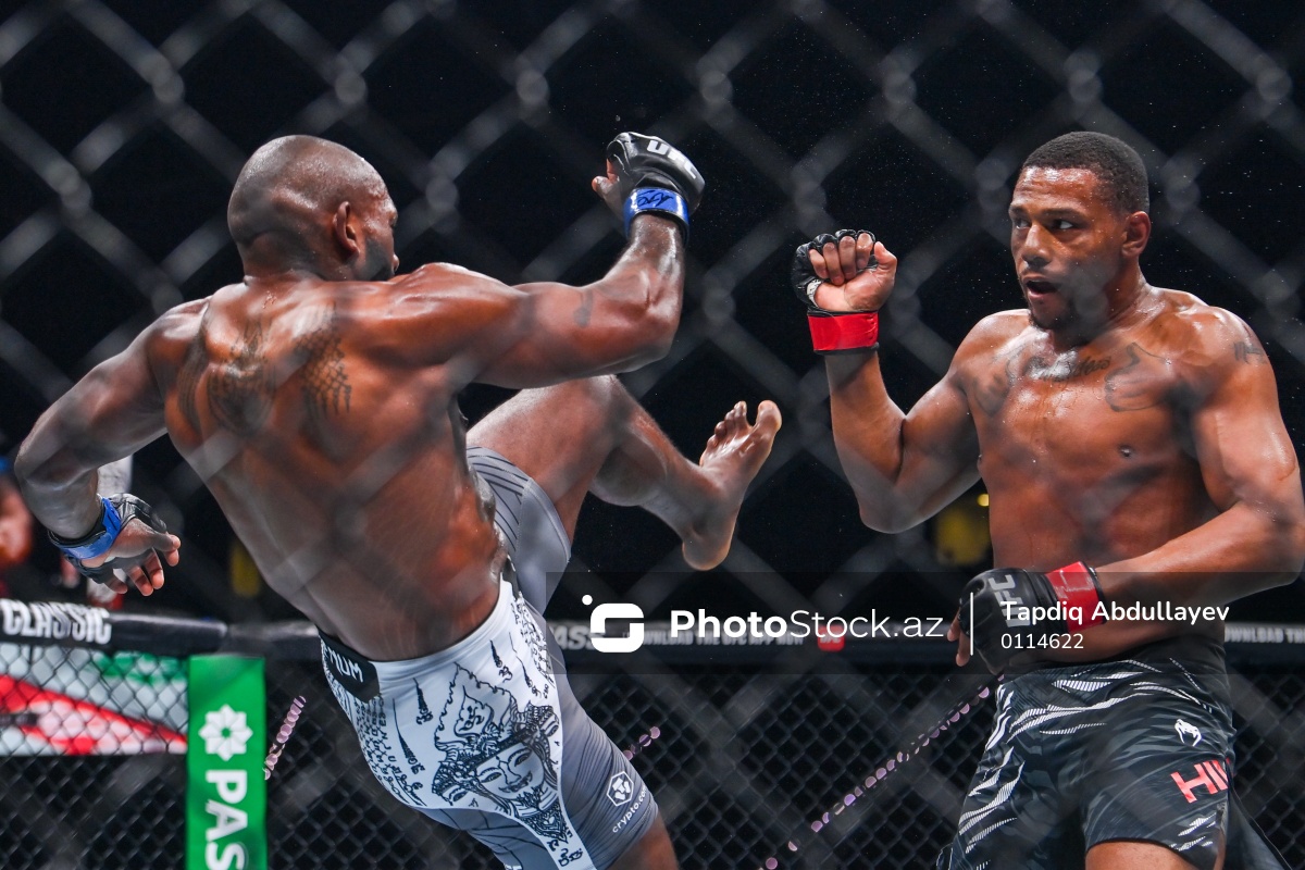 Bakıda ilk dəfə keçirilən “UFC Fight Night”da iştirak edən amerikalı UFC döyüşçüsü Xəlil Rauntri (sol), amerikalı UFC döyüşçüsü Camal Hill (sağ).
