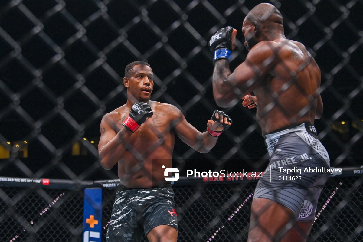 Bakıda ilk dəfə keçirilən “UFC Fight Night”da iştirak edən amerikalı UFC döyüşçüsü Camal Hill (sol), amerikalı UFC döyüşçüsü Xəlil Rauntri (sağ).