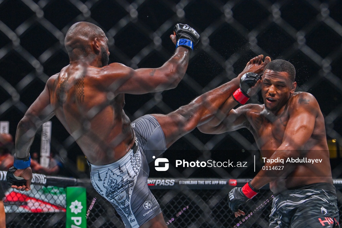Bakıda ilk dəfə keçirilən “UFC Fight Night”da iştirak edən amerikalı UFC döyüşçüsü Xəlil Rauntri (sol), amerikalı UFC döyüşçüsü Camal Hill (sağ).