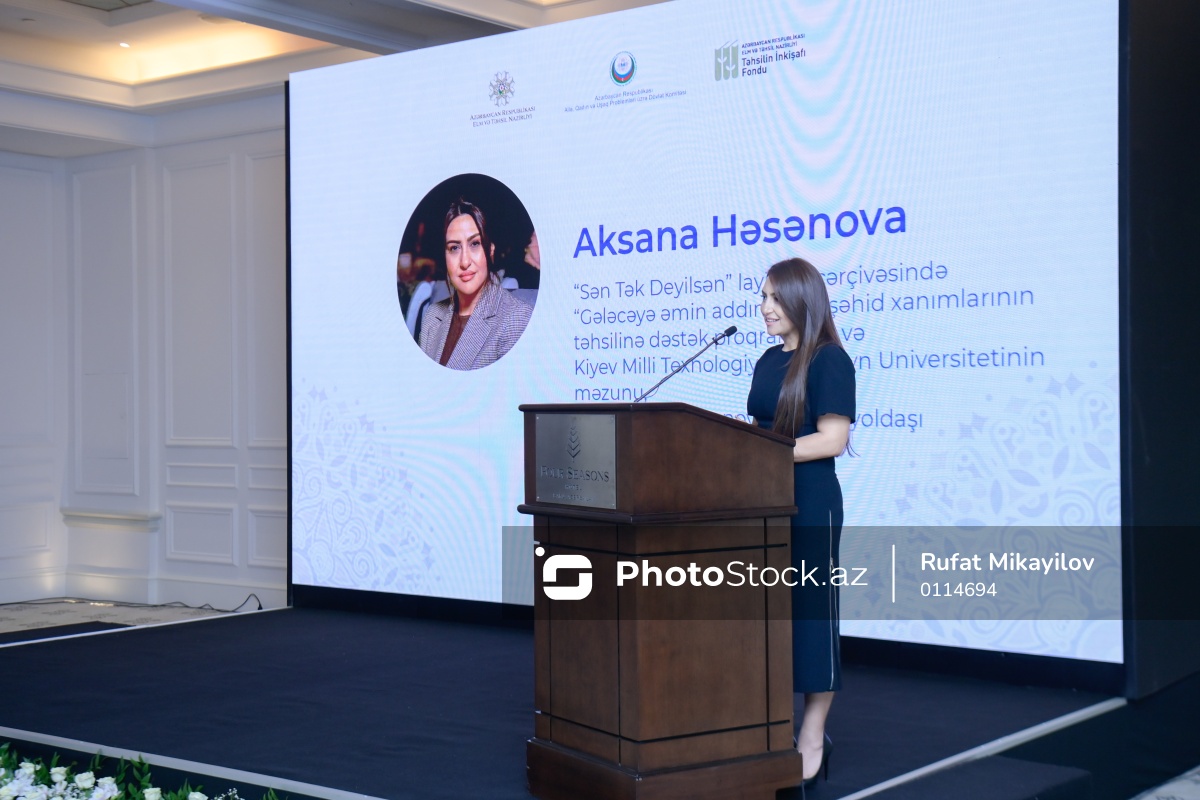 “Gənc qızların təhsilinə dəstək” layihəsi iştirakçılarının məzun günü tədbirində iştirak edən “Sən tək deyilsən” layihəsi çərçivəsində “Gələcəyə əmin addımlarla” şəhid xanımlarının təhsilinə dəstək proqramının və Kiyev Milli Texnologiya və Dizayn Universitetinin məzunu Aksana Həsənova.