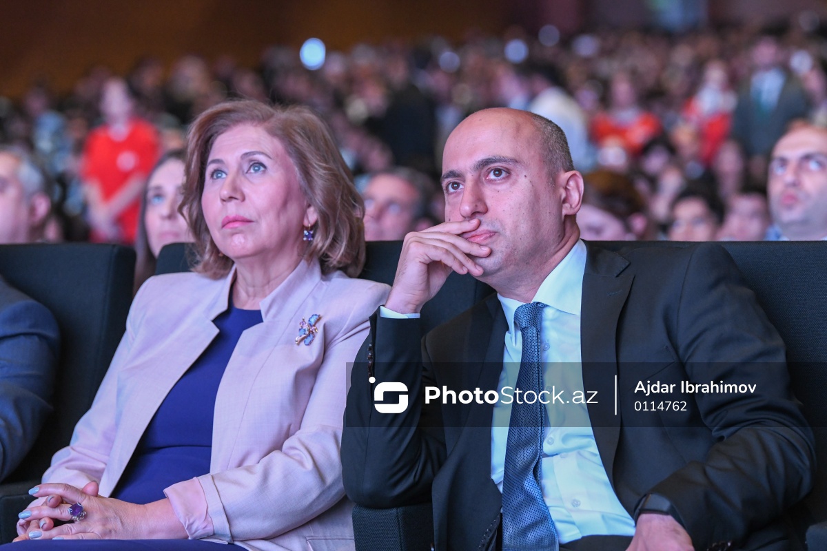 Respublika Fənn Olimpiadalarının mükafatlandırma mərasimində iştirak edən Azərbaycan Respublikası Ailə, Qadın və Uşaq Problemləri üzrə Dövlət Komitəsinin sədri Bahar Muradova (sol), Azərbaycan Respublikasının elm və təhsil naziri Emin Əmrullayev (sağ).