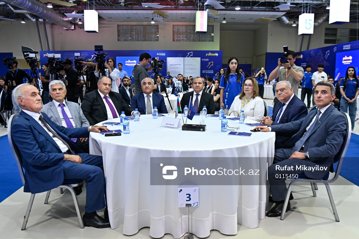 Beşinci “Yüksəliş” müsabiqəsinin yarımfinal mərhələsində iştirak edən (soldan-sağa) Azərbaycan Turizm və Menecment Universitetinin rektoru İlham Mədətov, Azərbaycan Dövlət Pedaqoji Universitetinin rektoru Cəfər Cəfərov, Bakı Slavyan Universitetinin rektoru Anar Nağıyev, Azərbaycan Dövlət İqtisad Universitetinin (UNEC) rektoru Ədalət Muradov, Bakı Dövlət Universitetinin rektoru Elçin Babayev, Azərbaycan Dövlət Mədəniyyət və İncəsənət Universitetinin rektoru Ceyran Mahmudova, Azərbaycan Respublikasının Prezidenti yanında Dövlət İdarəçilik Akademiyasının rektoru Urxan Ələkbərov, ADA Universitetinin prorektoru, Azərbaycan Respublikasının Milli Məclisinin deputatı Fariz İsmayılzadə.
