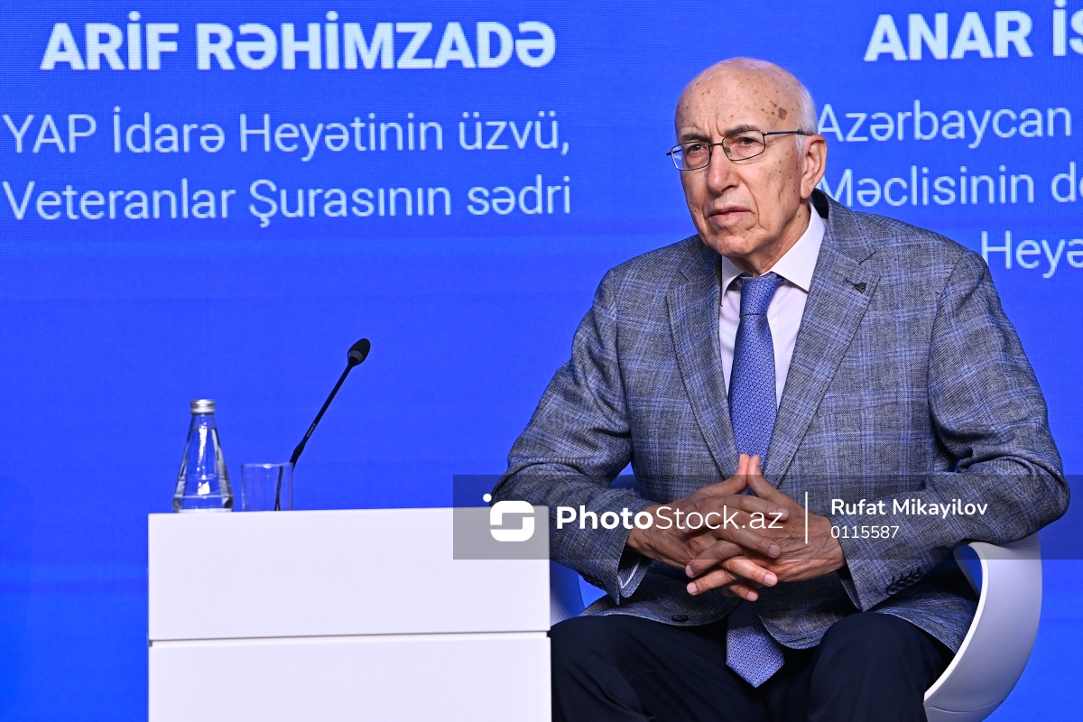 “Medianın inkişafında Ümummilli Lider Heydər Əliyevin rolu” mövzusunda konfransın panel sessiyasında iştirak edən YAP İdarə Heyətinin üzvü və Veteranlar Şurasının sədri Arif Rəhimzadə.